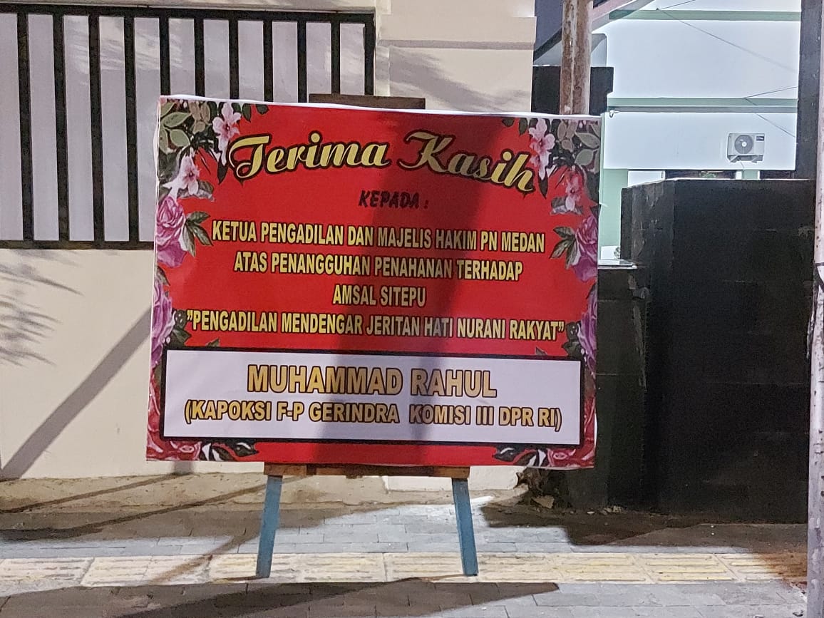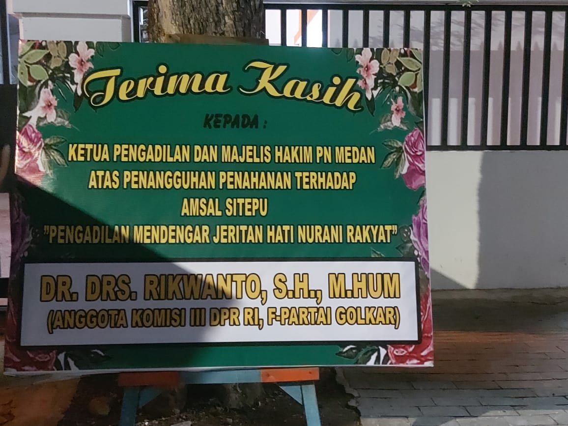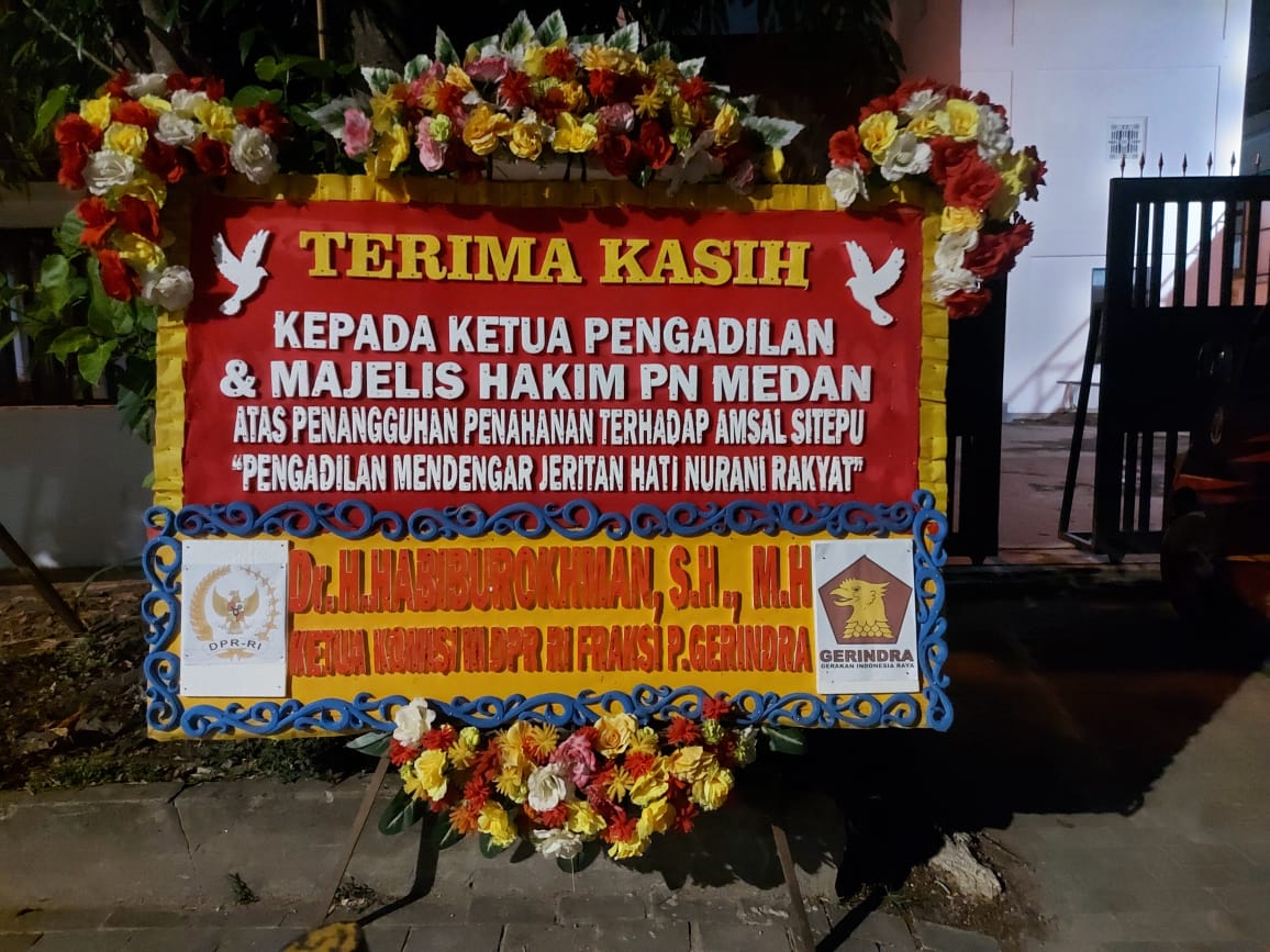Pasca penangguhan, terlihat puluhan papan bunga menghiasi Rutan Medan dan PN Tipikor Medan. Terlihat ucapan selamat atas dibebaskannya Amsal C Sitepu tertulis dalam papan bunga dari para Anggota Komisi III DPRI RI dan tokoh penting di Republik ini. (PS/RED)
